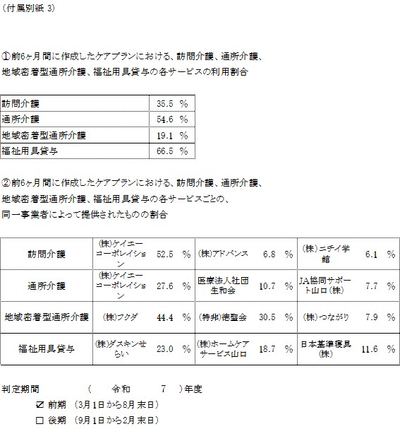当該指定居宅介護支援事業所において作成された居宅サービス計画の総数のうち訪問介護、通所介護、福祉用具貸与、及び地域密着型通所介護(以下「訪問介護等」という。)が、それぞれ位置付けられた居宅サービス計画の数が占める割合、及び前6ヶ月間に当該指定居宅介護支援事業所において作成された居宅サービス計画に位置付けられた訪問介護等ごとの回数のうちに同一の指定居宅サービス事業所又は指定地域密着型サービス事業者によって提供されたものが占める割合について、付属別紙 3の通り説明いたします。